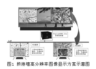 原理:VSE软件安装在用户需要有高分辨应用软件显示的网络工作站上,运行该软件后,即可产生高分辨率界面,用户显示器因分辨率限制不能生成和完全显示的图形,通过VlinkExpress?快速网络功能,能够将高分辨率应用软件的全部信息在大屏幕上完整地显示出来。拼接墙高分辨率图像显示解决方案见图1;与通常的高分辨率图像显示方式的比较见表1。