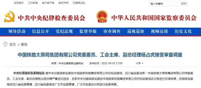 中国铁路太原局集团有限公司党委委员、工会主席、副总经理杨占虎涉嫌严重违纪违法,目前中央纪委国家监委驻中国国家铁路集团有限公司纪检监察组正对其进行纪律审查,经国家监委指定四川省监委管辖,四川省监委指定广元市监委管辖,广元市监委正对其进行监察调查。