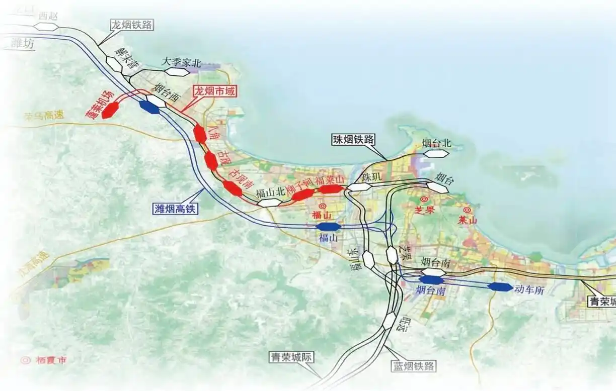 龙烟铁路市域化改造工程位于烟台市境内,是山东省重点铁路交通项目。工程利用烟台市内既有龙烟铁路、蓝烟铁路富余能力进行市域化改造,东起烟台站,西至烟台西站,通过新建蓬莱国际机场支线在烟台西站接轨,连通蓬莱机场站,线路全长46.6公里,其中:新建桥梁10.52公里,隧道9.04公里,桥隧占比41.6%。全线新建福莱山、柳子河、古现南、古现、八角、蓬莱机场等6座车站,改建烟台、珠玑、福山北、烟台西等4座车站,项目可研批复总投资75亿元,2024年9月底开工建设,计划2027年9月底建成通车。通车后,将以开行市域化公交列车的形式,串联起烟台站、烟台西站、蓬莱机场站等交通枢纽,是山东省首条市域铁路。