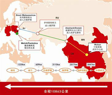 图为:汉新欧铁路国际货运专线运行示意图10月25日上午8时40分,一列装载价值500万美元电子产品的集装箱国际专列,从武汉吴家山铁路集装箱中......[查看]