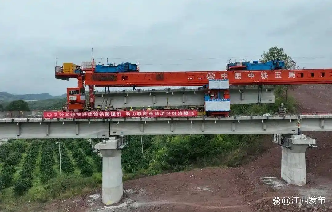随着最后1片24米T梁,稳稳架设在绵水特大桥桥墩上,瑞梅铁路全线最长桥梁,——绵水特大桥顺利完成架梁。截至目前,瑞梅铁路江西段桥梁土建工程已完成80%以上,架梁工程已完成T梁预制310孔,T梁架设222孔,预计12月上旬开始铺轨。