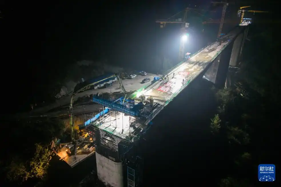 3月26日凌晨,在邵永高铁龙井头特大桥建设工地,中铁五局工人在进行连续梁合龙施工(无人机照片)。 3月26日,随着最后一方混凝土注 ...[查看]